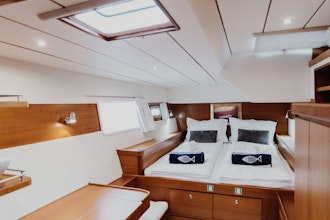 Bei einem Segelurlaub auf der Mala dreht sich alles um die große Freiheit. Die Freiheit zu wählen, was Sie tun möchten, wohin Sie segeln möchten und was Sie erleben möchten. Kapitän Zoki und Chef Sanja, die sich unter anderem um das leibliche Wohl an Bord kümmert, planen und organisieren mit Ihnen einen maßgeschneiderten, individuellen Urlaub zur Erkundung der faszinierenden kroatischen Inselwelt. Schon in dem Moment, wenn Sie den ersten Fuß an Bord setzten, haben Sie das Gefühl auf der Mala, einem Laguna 570 Katamaran, angekommen zu sein und fühlen sich bei Ihren beiden Hosts wie zuhause. Die Zauberformel für diese unglaublich entspannte Art Urlaub zu machen ist eine Mischung aus dem kristallklaren Wasser der Adria, versteckten, nur wenigen zugänglichen Buchten, idyllischen Fischerdörfern, atemberaubenden Sonnenuntergängen und lokalen kulinarischen Spezialitäten. Ihr schwimmendes Zuhause, dessen Interior 2019 einer Renovierung unterzogen wurde, bietet in 3 Kabinen mit en-suite Badezimmern Platz für bis zu 6 Gäste; ist also ideal für eine Gruppe von Freunden oder eine größere Familie. Die Mala hat dabei in ihren klimatisierten Kabinen erstaunlich viel Platz für Ihre Reisegarderobe. Die Master-Kabine ist dabei ein wenig größer als die beiden anderen Kabinen. Das eigentliche Highlight der Mala sind aber - wen würde es überraschen - Ihre Außenbereiche. Sanja serviert die Mahlzeiten am liebsten am überdachten, schattigen Freisitz mit Inselpanoramen der Extraklasse. Auch Liegegelegenheiten bietet die Mala ausreichend. Unser Lieblingsplatz sind ganz klar die beiden Netze zwischen den Rümpfen - übrigens nicht nur tagsüber, sondern besonders nachts zum "Star-Gazing". Für diejenigen, die auch an Bord nicht auf moderne Technik verzichten können verfügt das Boot über kostenloses Wifi und einen Flachbild-Fernseher. Alles in Allem ist die Mala ein herrliches Boot für Familien und Freundesgruppen mit Lust auf eine modernes Abenteuer. Herz und Seele dieses großartigen, maritimen Erlebnisses ist dabei das "Dream-Team" - Zoki und Sanja! Truly away from it all!