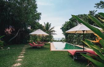 Auf einer spektakulären Landzunge, 40 Meter über dem Indischen Ozean, thront Cape Weligama wie ein Dorf aus einer anderen Zeit. Rund 30 Minuten östlich von Galle eröffnet sich hier ein Logenplatz über der palmengesäumten Südküste Sri Lankas - mit weitem Horizont, salziger Meeresbrise und Sonnenuntergängen, die den Himmel in flammende Farben tauchen.