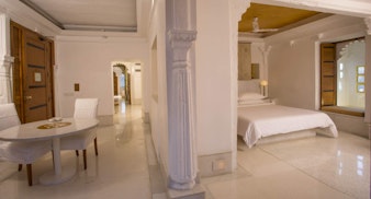 Uralte Tempel, glanzvolle Paläste und Festungen und ein Meer aus blau getünchten Häusern spicken das Stadtbild Jodhpurs. Bewacht werden diese architektonischen Meisterwerke von der rot-goldenen Wüste Thar. Allgegenwärtig ist der majestätische Bau der Burg Meherangarh, die auf einem Felsen thronend auf die Dächer der indischen Metropole blickt. Luxusquell der Wüstenstadt ist Ihr exklusives Hotel The Raas. Abseits des bunten Stadtlebens erwartet Sie eine Oase der Ruhe. Die Gebäude des The Raas verbinden Tradition mit Moderne: Ihr Refugium besteht zum großen Teil aus tiefrotem Sandstein, der an das jahrhundertealte Steinmetzhandwerk der Region erinnert. Aufgrund der perfekten Lage gibt fast jedes Zimmer im The Raas den Blick auf die Festung Meherangarh frei, die aus dem 15. Jahrhundert stammt. Die Suiten des The Raas überraschen mit einem exklusiven modernen Interieur, das im Kontrast zu seiner historischen Umgebung steht. Als Gast in den Garden Rooms profitieren Sie von einem eigenen, liebevoll gepflegten Außenbereich. Die klimatisierten Innenräume der Wohneinheit bestechen durch florale Ornamentik und natürliche Materialien. Die drei exklusiven Heritage-Suiten befinden sich in einem Gebäudeteil aus dem 18. Jahrhundert, der einstigen Rajput Residenz. Spüren Sie hier den Zauber der vergangenen Zeit. Die felsigen Mauern aus Sandstein wirken wie die eines alten Tempels. Eine gusseiserne Badewanne, moderne Kunstwerke und ein privater Innenhof verleihen den Wohneinheiten das gewisse Extra. Freuen Sie sich nach einer intensiven Sightseeingtour auf ein romantisches Dinner im Restaurant Darikhana. Nachdem die Sonne untergegangen ist, erleuchten Kerzen die Tische unter freiem Himmel. Der Küchenchef bereitet Ihre Gerichte mit handgemahlenen Gewürzen und Bio-Gemüse aus dem eigenen Garten zu. Nachdem Sie tagsüber die Wüste Thar erkundet haben, tut eine vitalisierende Behandlung im Spa des The Raas doppelt gut. Die hier verwendeten Aromaöle sind von höchster Qualität, wurden kalt gepresst und bestehen nur aus natürlichen Stoffen - eine Wohltat für Ihre Haut. Entspannen Sie bei einer Massage und fühlen Sie sich nach einem Peeling wie neu geboren.