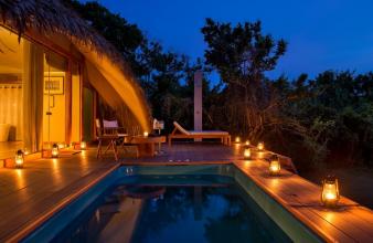 Auf einem weitläufigen Gelände zwischen Buschdschungel, Lagune und Meer verteilen sich nur wenige, großzügige Luxury Cabins mit privatem Pool. Jede Cabin ist freistehend, von Vegetation umgeben und so positioniert, dass maximale Privatsphäre gewährleistet ist. Reetdächer, natürliche Materialien und große Glasfronten schaffen eine harmonische Verbindung zur Umgebung, während das klare, reduzierte Design den Fokus bewusst auf die Natur lenkt. Der private Pool und die weitläufige Terrasse machen jede Unterkunft zu einer persönlichen Safari-Villa.