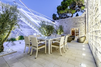 Die Villa Pugliesi befindet sich in der malerischen Bucht von Zaton, nur 10 Autominuten von Dubrovnik entfernt. Sie ist ein außergewöhnliches privates Anwesen mit 6 geräumigen Schlafzimmern, Wohnräumen und weitläufigen mediterranen Gärten mit einem Außenpool und einer privaten Kapelle. Die Villa ist eine ideale Wahl für Familien und Gruppen von Freunden und bietet Platz für bis zu 14 Personen. Die im 15. Jahrhundert erbaute Villa war ursprünglich als Sommerresidenz für Aristokraten gedacht. Die Lage am Wasser, das beeindruckende, aber unprätentiöse Interieur, das ruhige Gartenambiente und die absolute Privatsphäre machen es zu einem repräsentativen Beispiel für die Architektur der Renaissance in Dubrovnik. Es ist schon fantastische, wie Sie die vergangenen Jahrhunderte spüren können, wenn Sie die ursprüngliche Steintreppe hinaufsteigen oder nach einem Buch in der Wandnische aus dem 15. Jahrhundert greifen. Der Haupteingang der Villa Grand Mansion befindet sich direkt an der Uferpromenade. Beim Betreten des Innenhofs strahlen die massiven Steinmauern sofort ein exklusives Ambiente und echte Privatsphäre aus. Von hier aus erreichen Sie das Haupthaus mit 580 m² Wohn-Fläche auf zwei Etagen. Im Innenraum dominieren typische lokale Materialien wie Kalkstein, Tuff und hochwertiges Holz. Das Eingangsfoyer ist der zentrale Raum im Erdgeschoss und dient gleichzeitig als Begrüßungsbereich und Lounge. Rechts vom Foyer befinden sich zwei Doppelzimmer mit Badezimmern und direktem Ausgang in die Gärten. Wenn Sie vom Foyer nach links abbiegen, passieren Sie die voll ausgestattete Küche, einen modern ausgestatteten Barbereich, ein gemütliches Wohnzimmer mit Kamin und einen beeindruckenden Essbereich. dominiert von einem massiven, einteiligen Tisch aus Holz und Stein, der 16 Personen Platz bietet. In der 1. Etage befindet sich die Bibliothek, ein luftiger Raum voller Licht, mit hohen Decken, großen Fenstern und Doppeltüren, die auf eine der beiden Terrassen im ersten Stock führen. Die erste Etage beherbert außerdem 4 Duplex-Luxus-Suiten, die sich jeweils auf zwei Etagen befinden und alle ähnlich aufgebaut sind: eine komfortable Lounge und ein modernes Badezimmer auf der unteren Ebene. Oben finden Sie ein Kingsize-Doppelbett. Satellitenfernsehen, Safe und Toilettenartikel in jedem Badezimmer sind Standard für jede Suite. Das wahre Juwel der Villa Grand Mansion liegt hinter dem Haupthaus. Die terrassenförmig angelegten mediterranen Gärten erstrecken sich über 1500 m² und sind einfach unglaublich. In Verbindung mit dem Außenpool, einem schattigen Loungebereich und einem Außengrill sind die Gärten sicherlich der Ort, an dem Sie die meiste Zeit verbringen werden. Um Ihren Aufenthalt in der Villa perfekt zu machen und Ihre Erfahrung mit der Region zu vervollständigen, steht Ihnen ein Villa Manager für alle Informationen und Concierge-Services zur Verfügung.