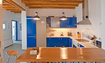 Die Moderne Villa mit Blick auf das Blau der Ägäis, den goldenen Strand und die Dryos-Bucht ist ein charmantes Privathaus in sehr panoramischer Lage, nur wenige Autominuten vom Meer entfernt. Das im typisch kykladischen Stil erbaute Haus besteht aus drei Ebenen und einem terrassenförmigen, gepflegten Garten. Eine geräumige Außenterrasse im Schatten einer traditionellen griechischen Pergola umgibt den Haupteingang. Der Haupteingang selbst öffnet sich zu einem gemütlichen Wohnbereich mit Sitzgelegenheit und einem großen Esstisch, der mit zeitgenössischen Kunstwerken dekoriert ist. Eine gut ausgestattete offene Küche mit einem komfortablen Barbereich befindet sich gleich daneben. Auf der gleichen Etage befindet sich auch das Hauptschlafzimmer mit zwei Einzelbetten (zusammengeschoben kann ein Doppelzimmer entstehen) mit Zugang zur Terrasse mit Meerblick. Im Obergeschoss befindet sich ein weiteres großes Schlafzimmer mit einem großen Bad und Zugang zu einer geräumigen Dachveranda mit herrlichem Panoramablick. Der private Infinity-Pool der Unterkunft befindet sich in der unteren Etage und ist von grünen Bäumen und einem Garten mit einer geräumigen Pergola im Freien und einer Sonnenterrasse umgeben. Von der Poolterrasse aus haben Sie Zugang zu einem weiteren attraktiven, separaten Gästezimmer mit Doppelbett, eigenem Bad und Meerblick. Auf der Poolebene befindet sich ein kleineres Studio mit einem Schlafsofa und einem eigenen Bad, ideal für Teenager oder das Kindermädchen. Alternativ kann das Studio auch als kühles Wohnzimmer des Poolbereichs dienen. Überall auf den Terrassen und im Poolbereich der Unterkunft befinden sich Hängematten, Liegen, Liegen und viele Sitzbereiche. Das Anwesen ist ein sehr angenehmer Rückzugsort in Paros, abseits der Massen, aber günstig gelegen, nicht weit von einem der schönsten und längsten Sandstrände der Insel entfernt. Die Villa wurde in vielen internationalen Magazinen für Innenarchitektur veröffentlicht.